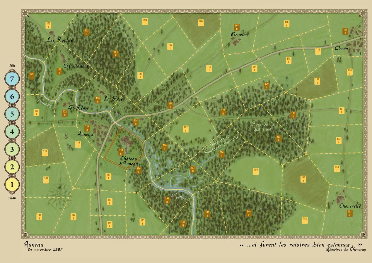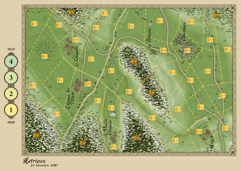 Métrieux (December 10, 1587): Pilat Massif, December 10, 1587: the weather is dreary and cold, the sky gray, the cloud cover low. After the defeat of the German mercenaries at Auneau against the Duke of Guise on November 24, 1587, a Protestant troop is attempting to return to its base in Vivarais with a small contingent of soldiers. This contingent comprises about one hundred cuirassiers and approximately two hundred mounted arquebusiers. Its leader is François de Châtillon, son of Admiral de Coligny. At the cost of forced marches, they have managed to keep the army of the Catholics of Lyon at bay, who have been ordered to intercept them. The men are as exhausted as the horses; they are gripped by the fear of crossing this hostile Pilat, but they believe in a small miracle that will allow them to reach their homes before nightfall. The Catholics, far more numerous, believe they can easily overcome this small band and thus seize their belongings… This small battle serves as an introduction to the system, with few counters and a small map.