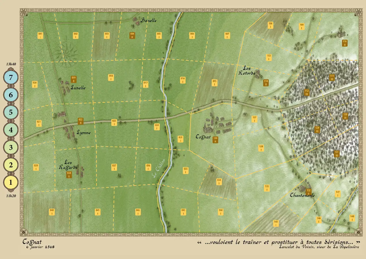 The rules and the five battles offered are based on extensive research and a solid bibliography, drawing on works written by contemporaries, notably François de la Noue for the Protestants and Blaise de Montluc for the Catholics, as well as precise topographical surveys of each of the battlefields still accessible, except for Saint-Denis… Are you ready to don the armor of the Prince of Condé, Admiral de Coligny, the Constable of Montmorency, Anne de Joyeuse, or Henry of Navarre and fight your enemies “with fire, iron, and faith”? P3F, the new game from Hexasim, offers you this opportunity through an innovative and elegant game.